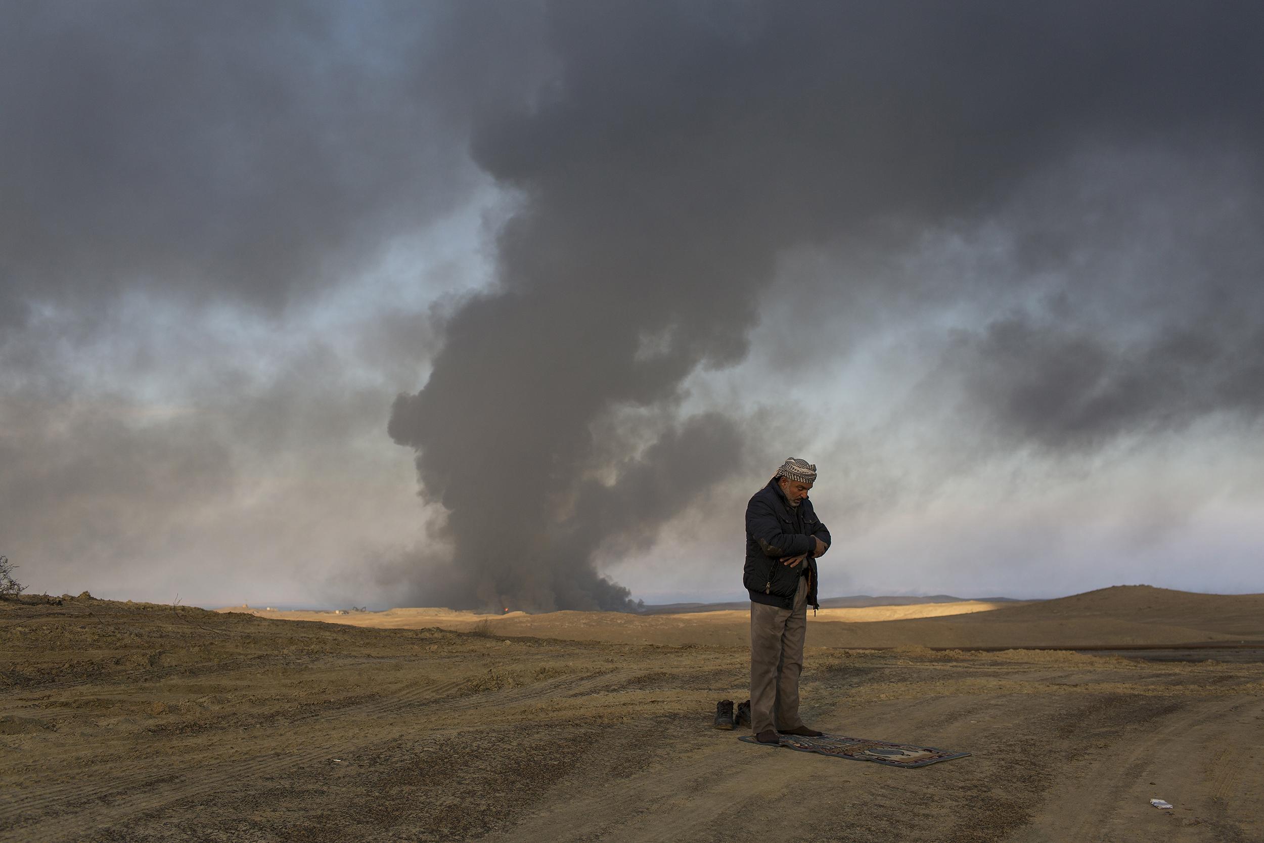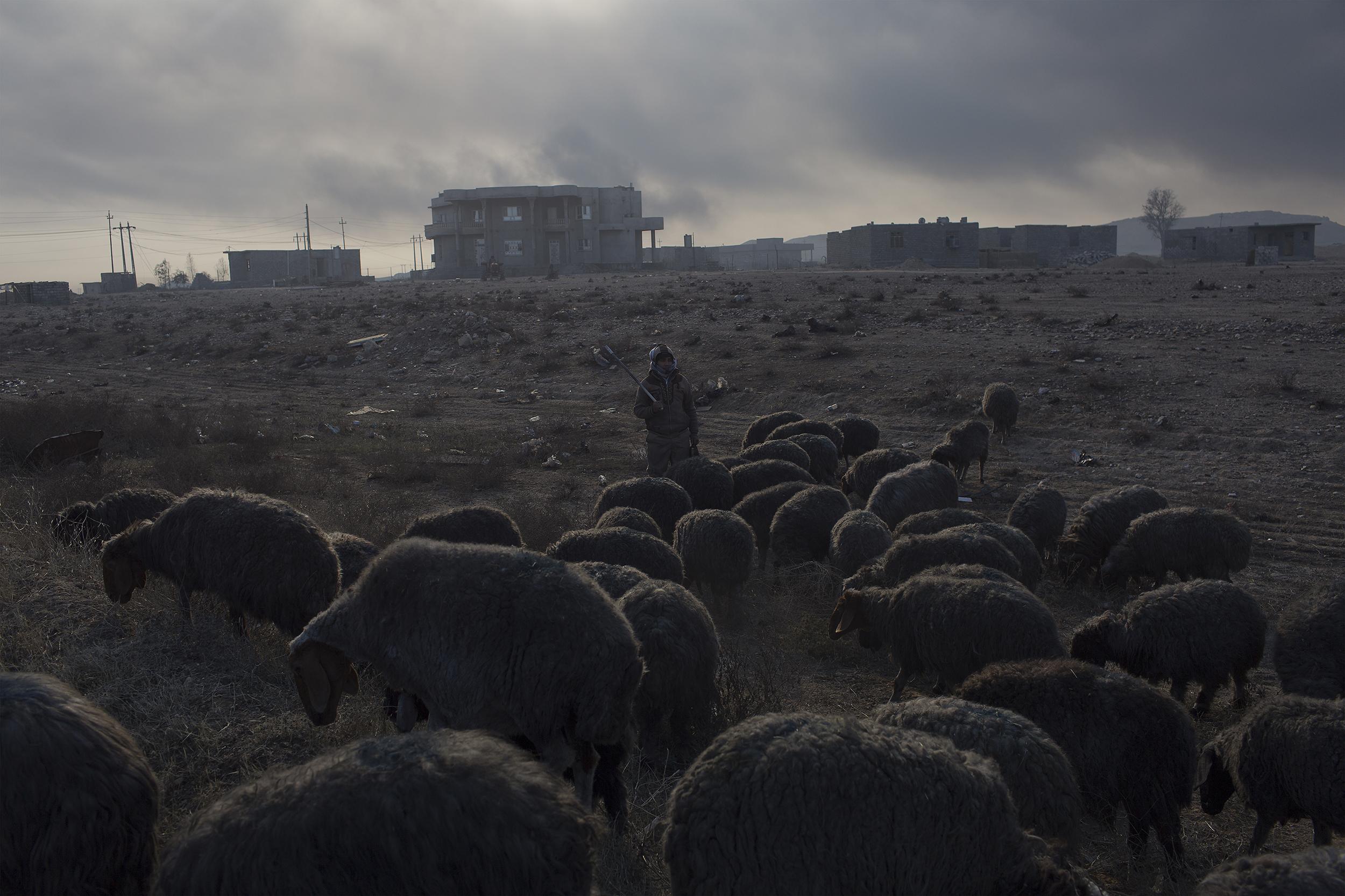 불타오르는 유전에서 발생한 연기는 양떼들도 양치기도 검게 그슬렸다. 불타는 유전의 연기로 대낮에도 어두운 스산한 풍경이다. 2016년 12월 가야라, 이라크