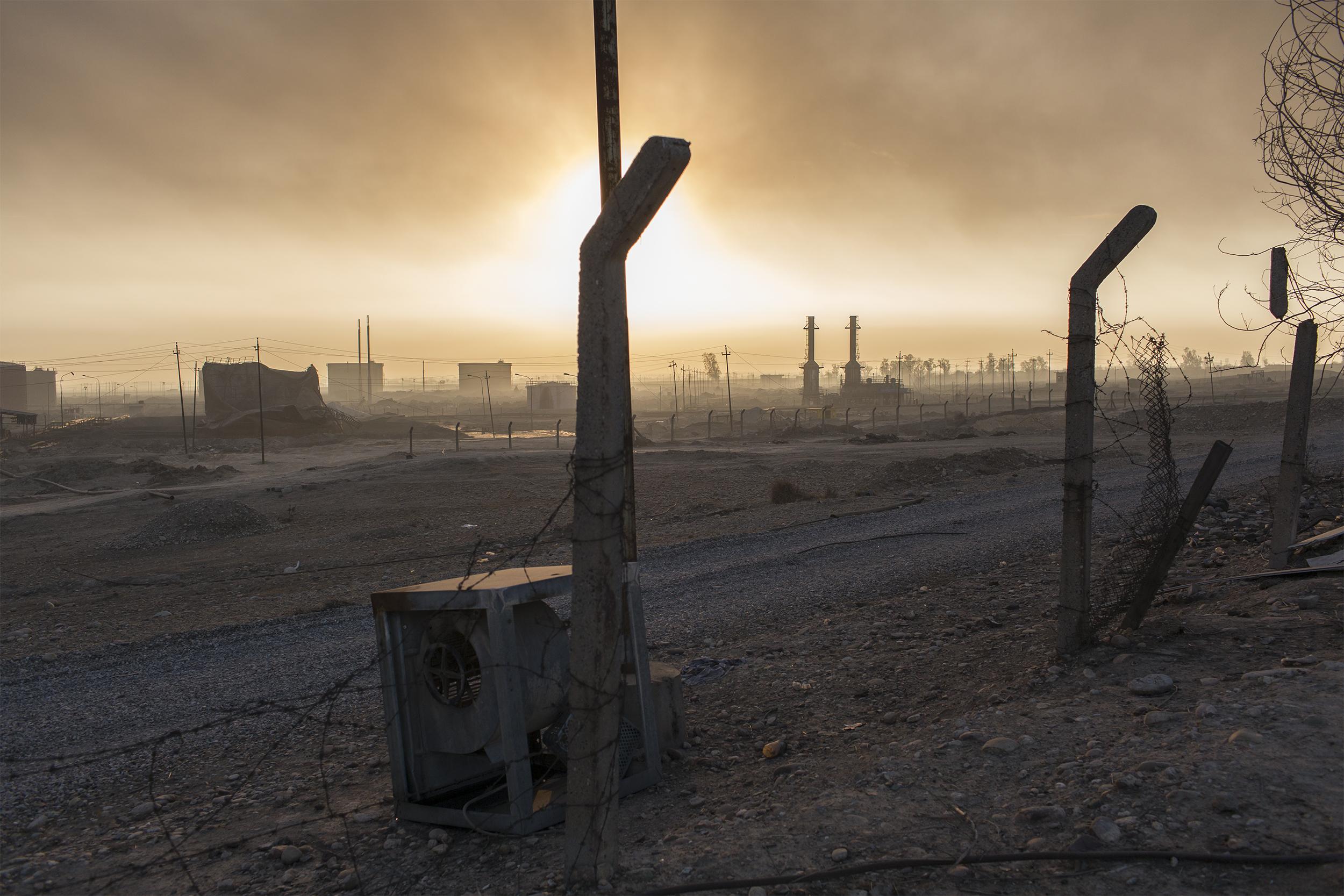 이라크 가야라 근처. 1950년대 만들어진 낙후된 정제소는 지속되는 전쟁으로 보수 유지가 불가능해 문을 닫은 지 오래다. ISIS가 퇴각 도중 불지른 유전의 연기에 휩싸여 마치 지옥의 묵시록을 보는 듯 하다. 2016년 12월 가야라, 이라크