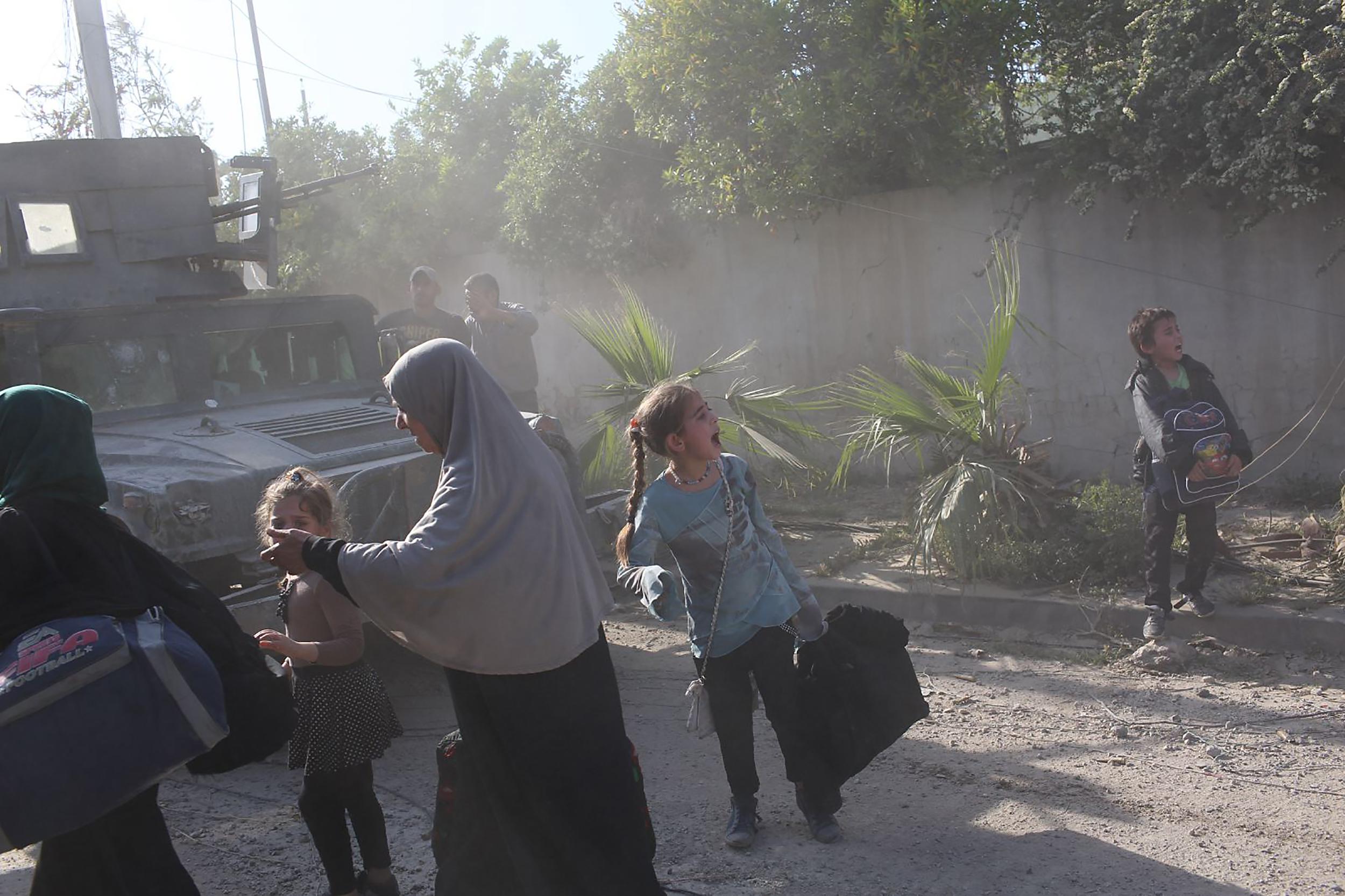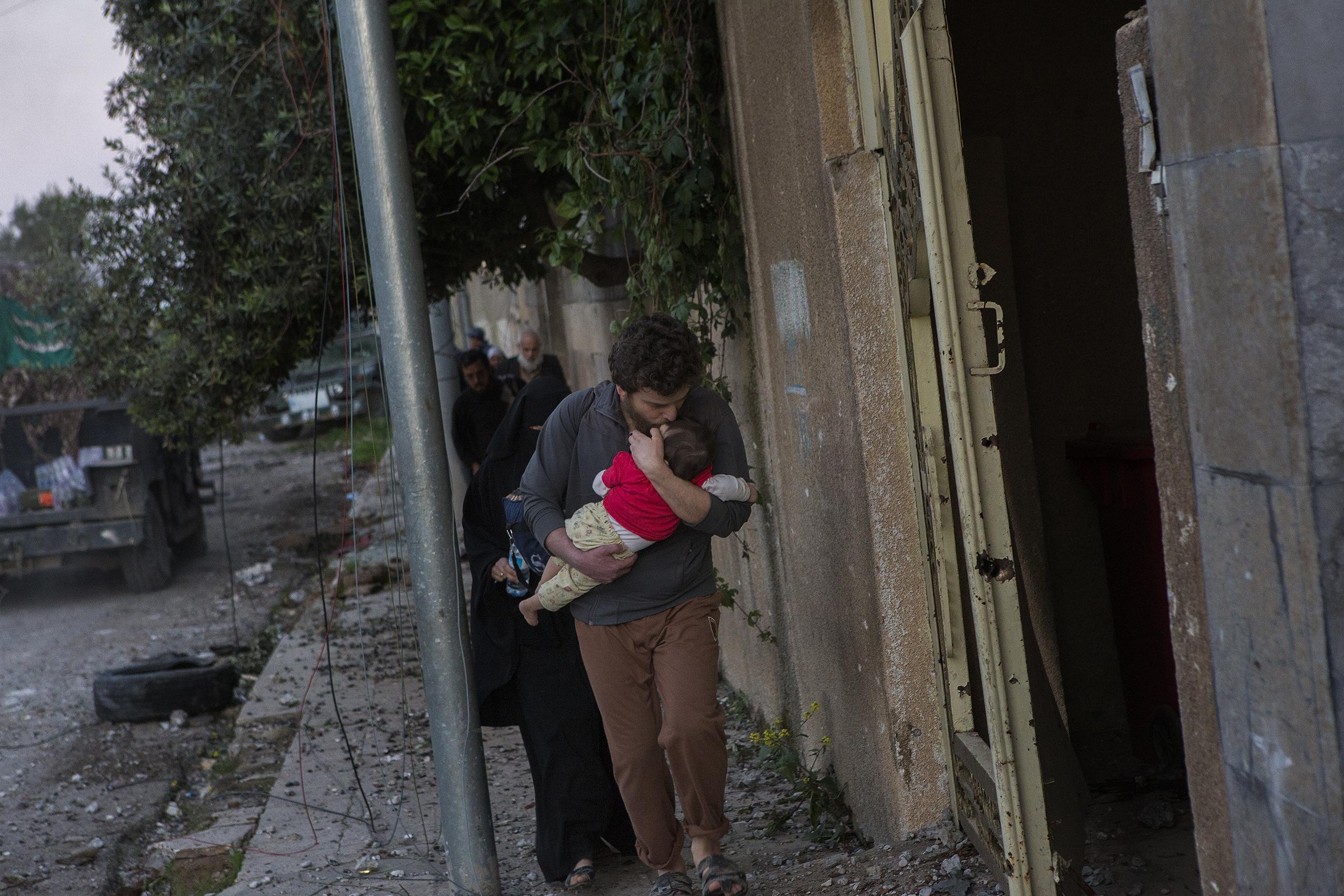 ISIS는 이라크 정부군의 진격을 늦추기 위해 일반 시민들을 인간 방패로 삼았고, 퇴각 도중 일부를 포로로 삼아 데리고 갔다. 생이별한 가족들을 찾는 아비규환의 혼란이 이어졌다. 2017년 4월 모술, 이라크