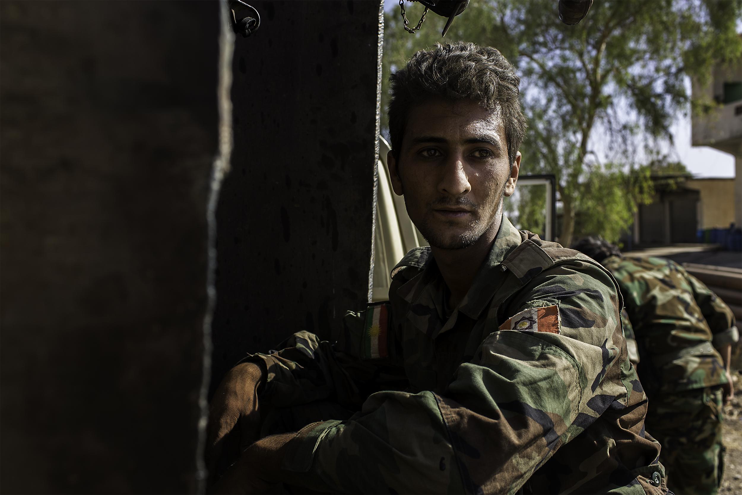 ISIS에 대항해 싸우던 쿠르드계 민병대의 젊은 군인. 갑작스런 매복의 공격을 가까스로 벗어난 후. 2016년 10월 바시카, 이라크
