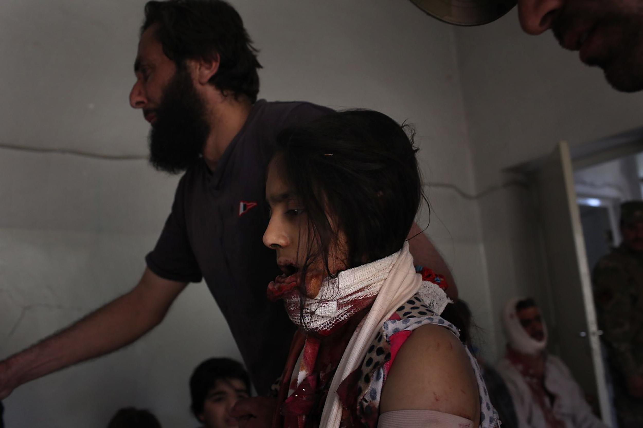 ISIS와의 치열한 교전 중에 부상 당한 어린 소녀가 안전지대로 빠져나오고 있다. 2017년 4월 모술, 이라크