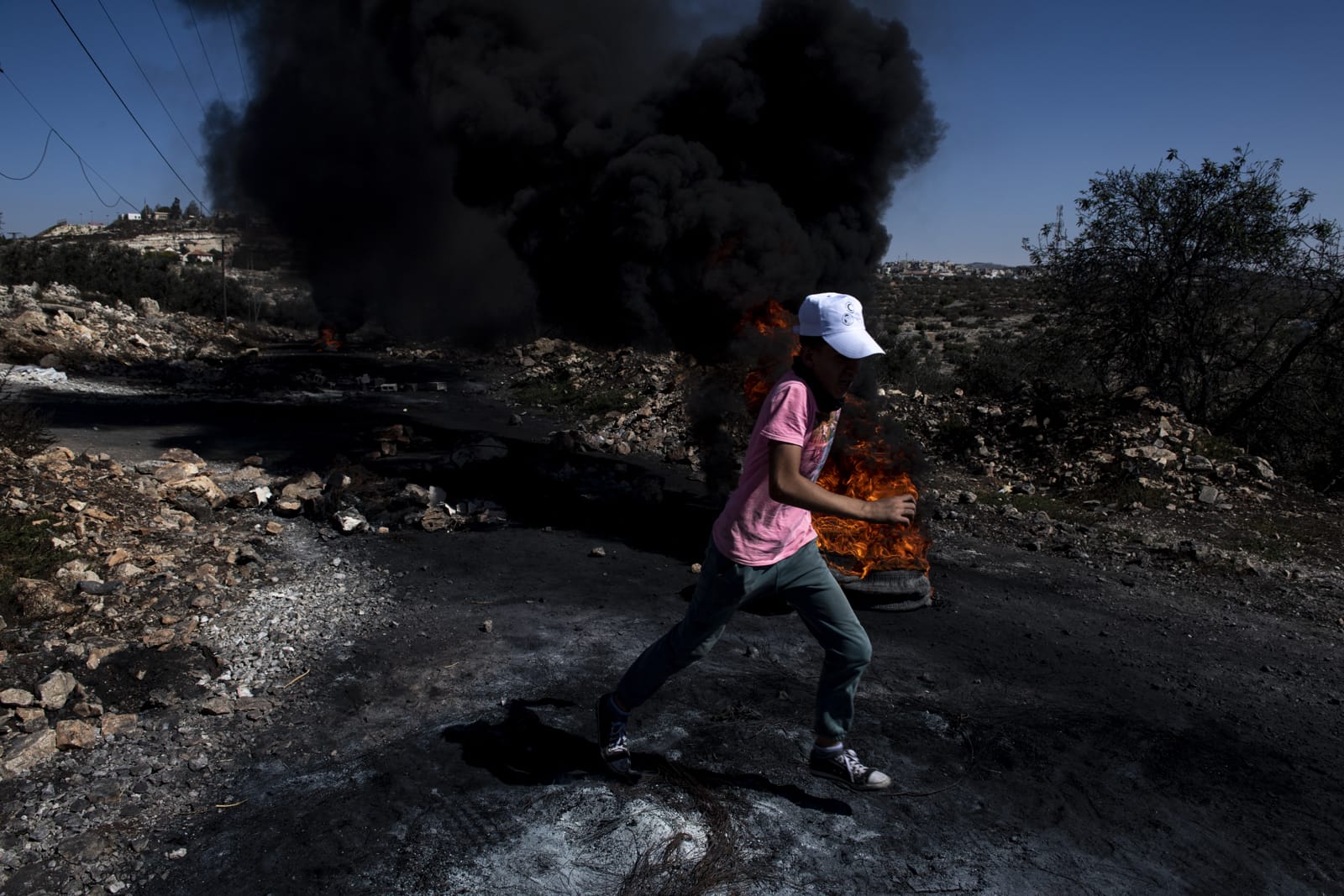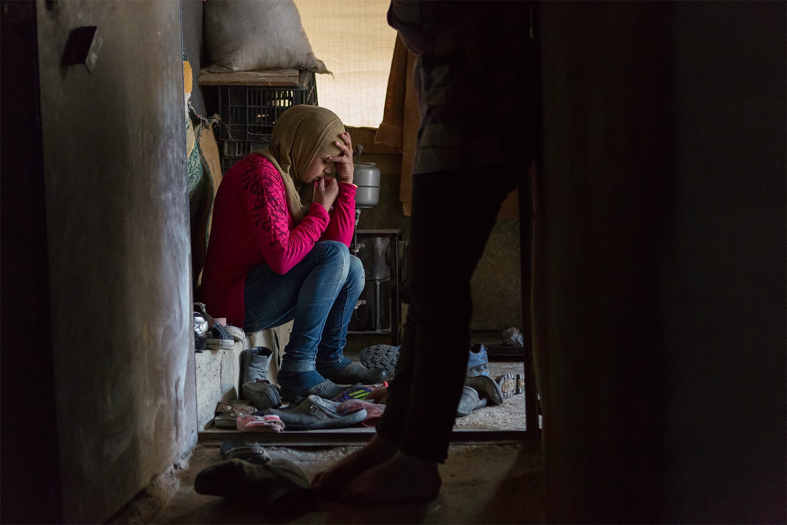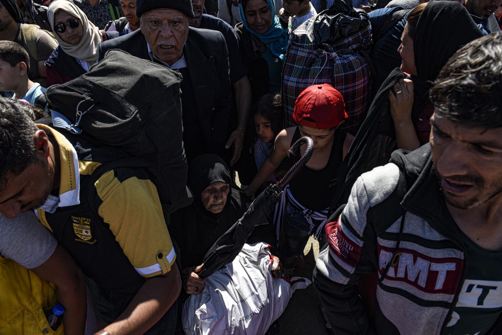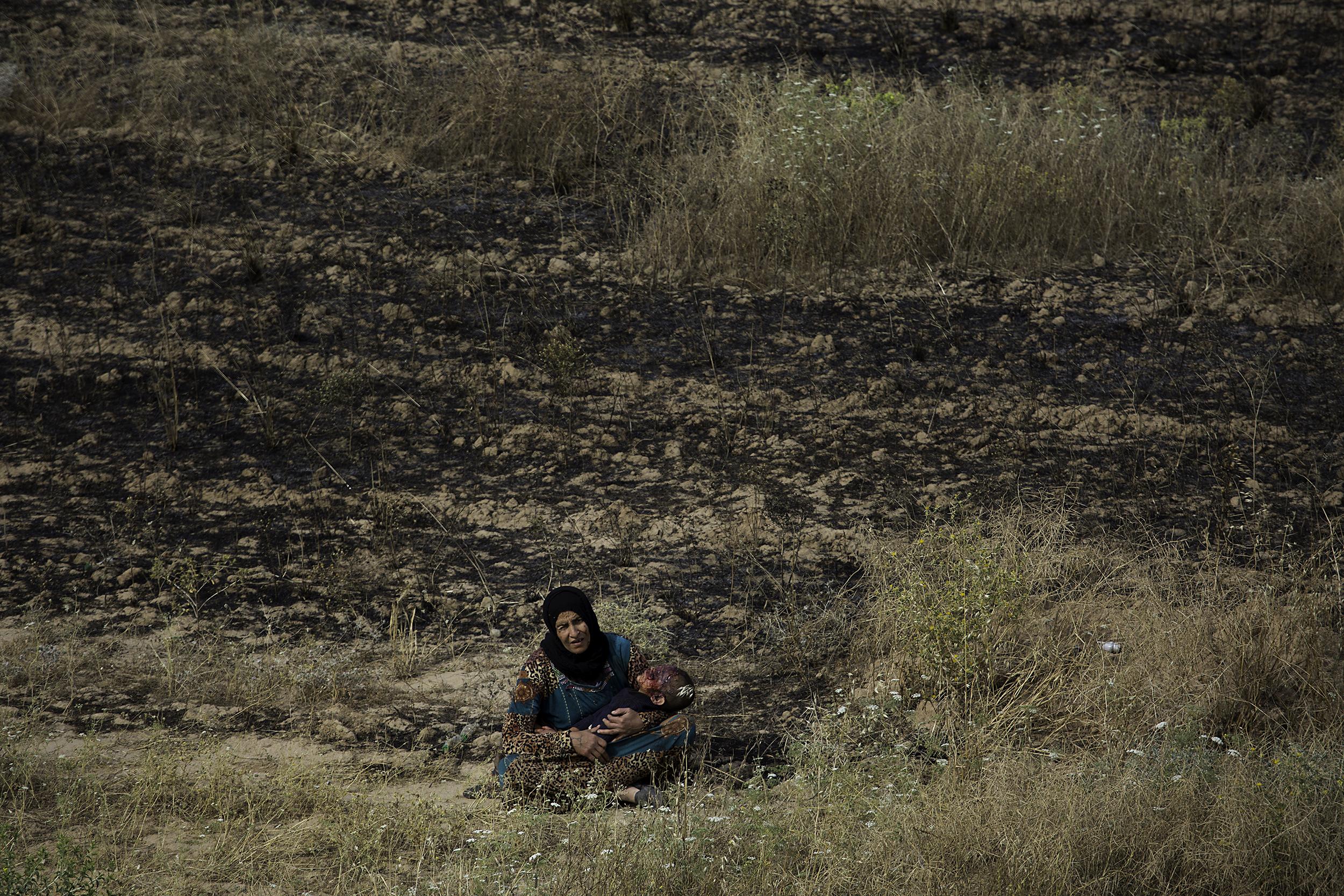 ISIS의 공포정치에서 탈출한 티그리스 출신 이라크인 모자. 무인지대를 거쳐 10km여를 걸어오는 도중 어린 아들이 지뢰를 밟았지만 속수무책으로 부상 당한 아이를 안고 계속 걸어야만 했다. 쿠르드군 참호에 도착하여 도움을 청하고 있다. 2016년 5월 하위자, 이라크