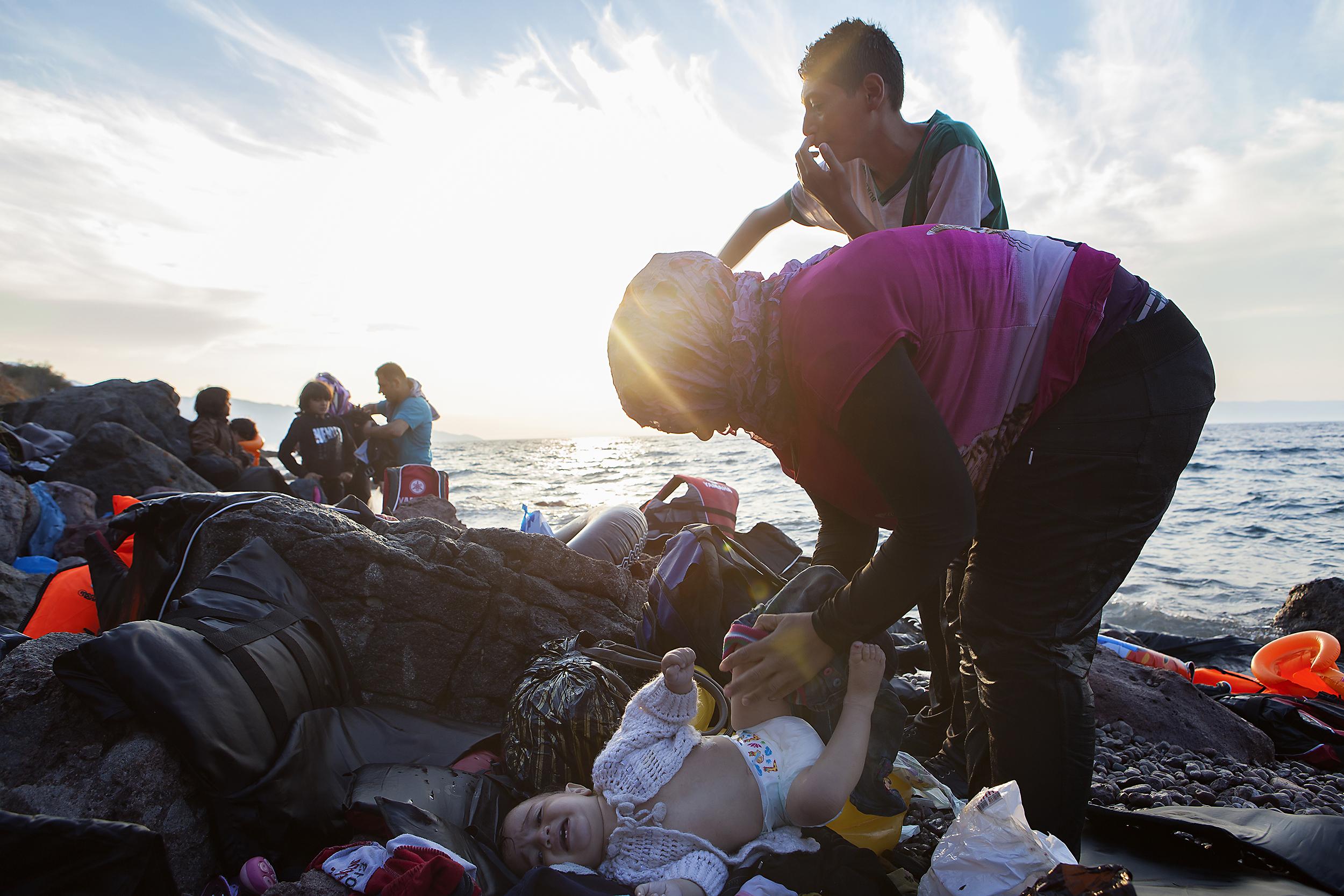 레스보스 섬에 도착한 한 시리아 여성이 아이의 기저귀를 갈고 있다. 찟어진 고무보트와 이리저리 흩어진 구명 조끼들, 난민들이 남기고 간 온갖 잡동 사니의 틈바구니에서, 마치 평온한 일상처럼 육아를 수행하는 어머니의 모습은 초연하기까지 하다. 자식에게 전쟁의 위험이 없는 보다 나은 환경을 선사하겠다는 일념으로 이 어머니도 이 불안한 여정길에 나섰을 것이다. 2015년 9월 레스보스, 그리스