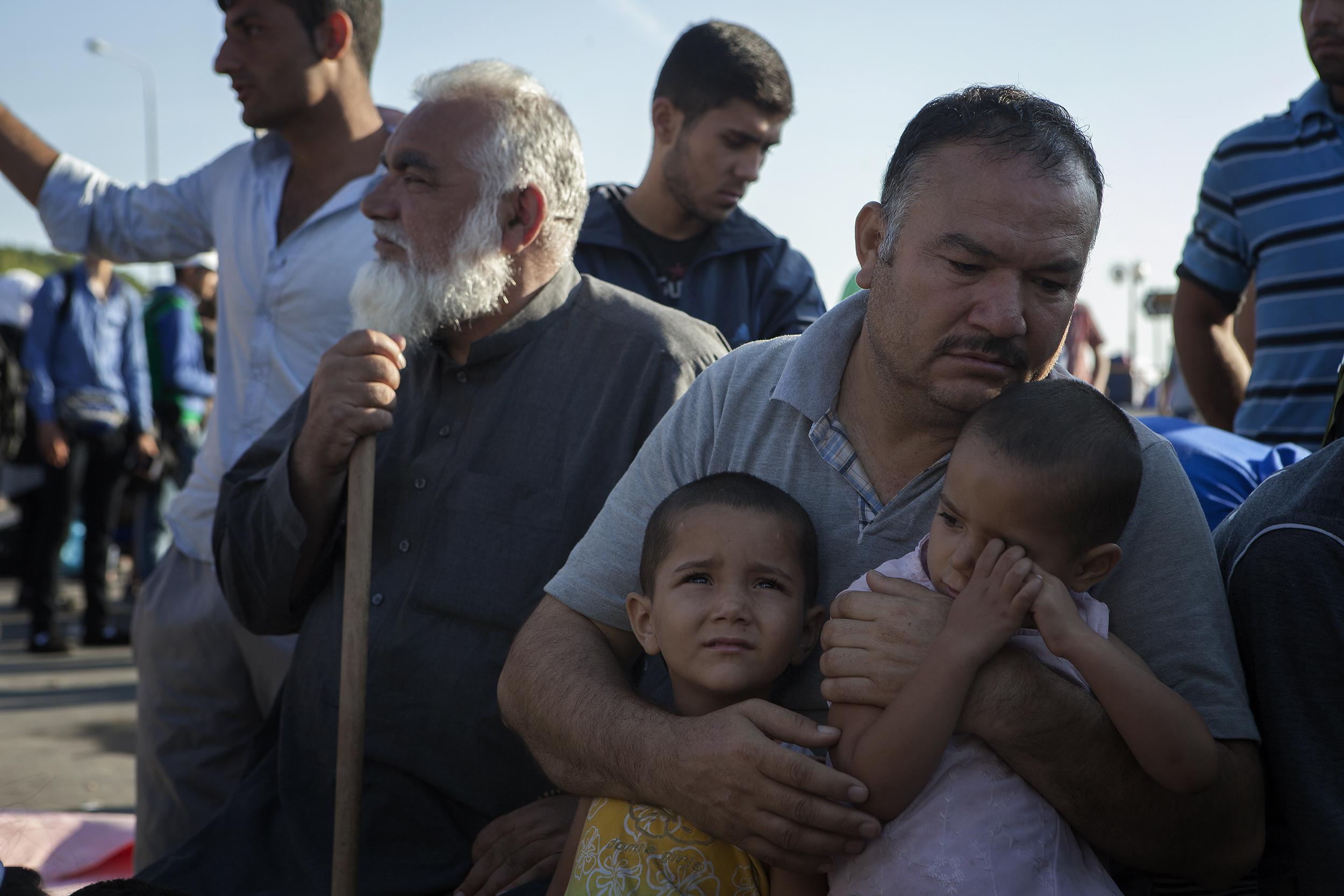 조부에서 손자까지 3대 모두 피난의 여정에 오른 아프가니스탄 가족. 비용 때문에 또는 혹시라도 발생할 수 있는 위험과 사고를 최소화하기 위해 가족 구성원의 일부만이 떠나는 경우가 많지만 간혹 대가족 전체가 그 고난을 함께 헤쳐나가는 경우도 있다. 2015년 9월 레스보스
