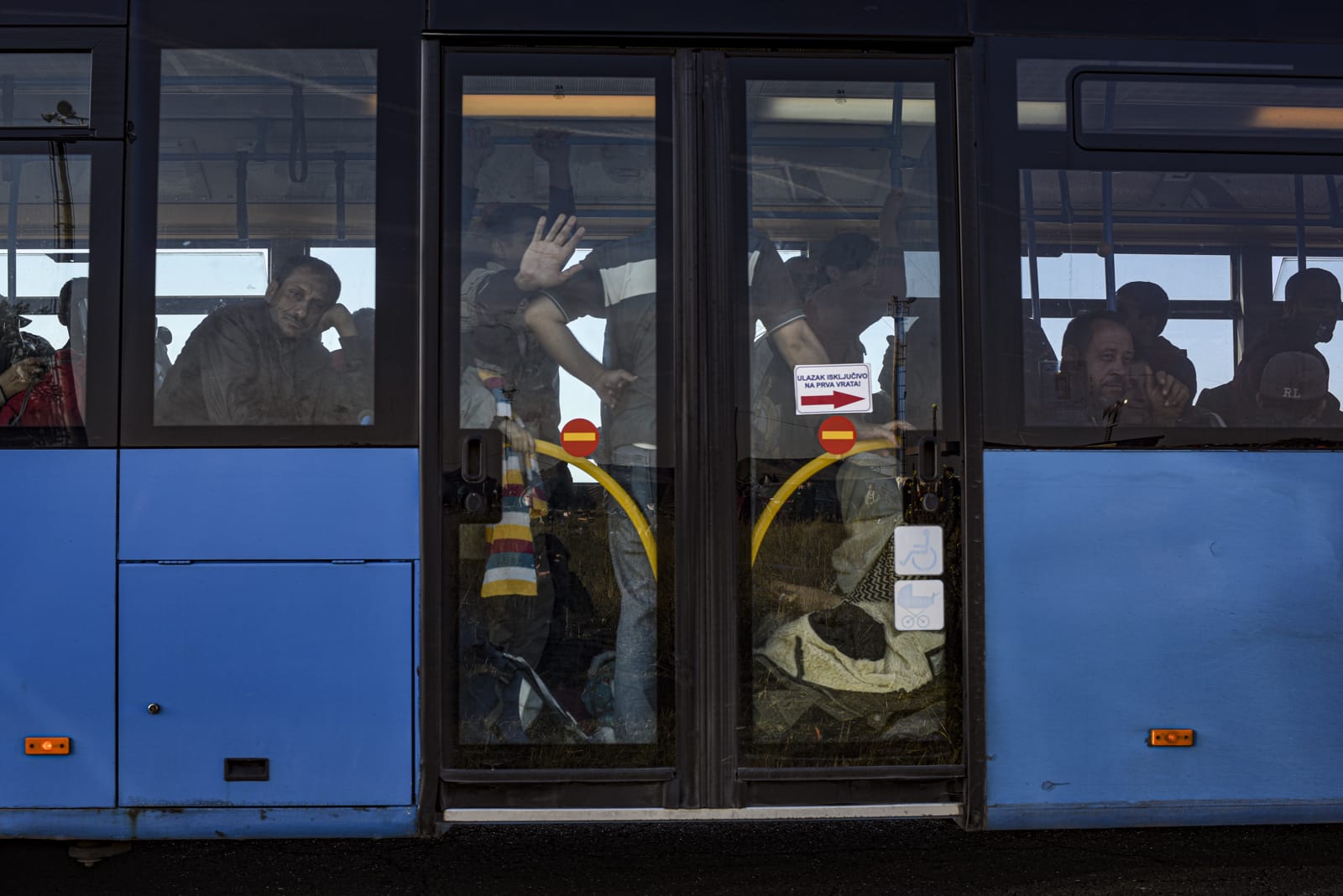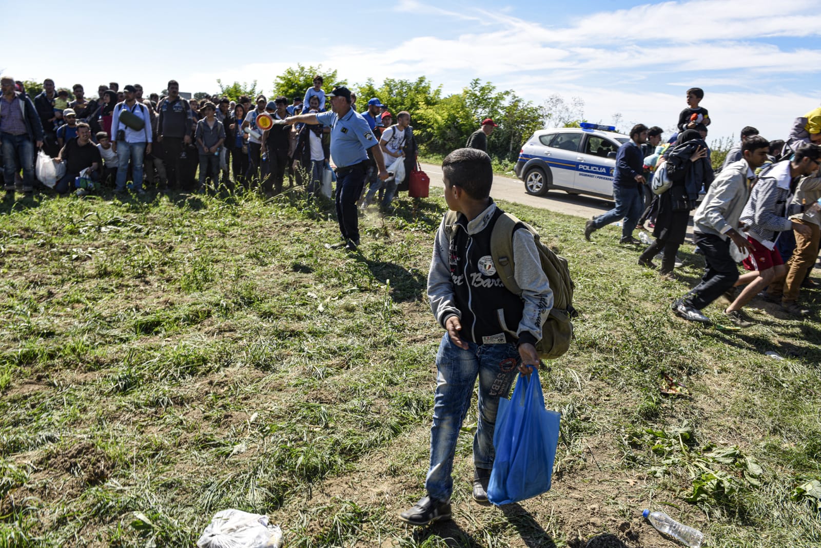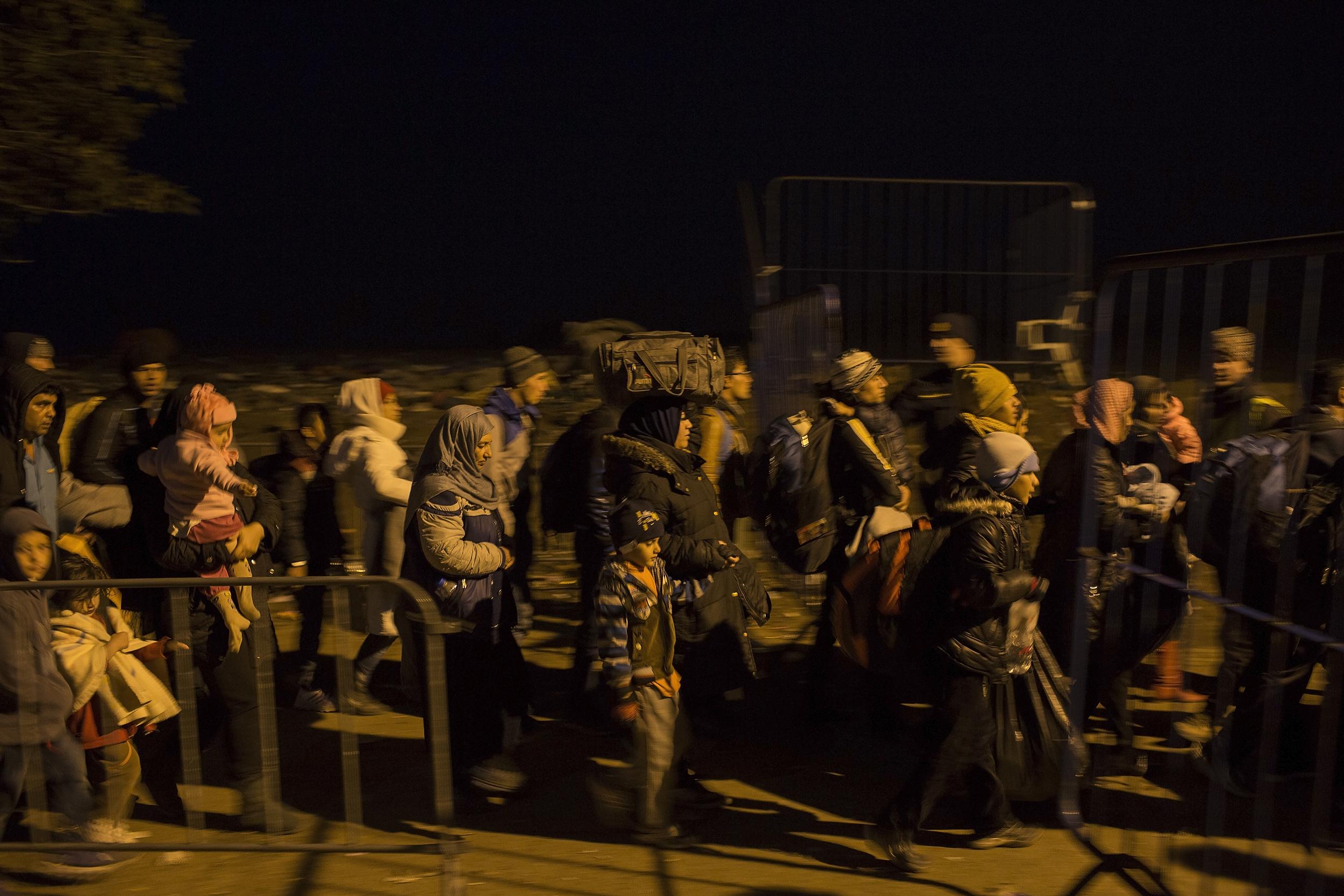 북마케도니아 세르비아 국경 지역. 유럽연합 국가 내 목적지 도달을 위해 난민들은 발칸 국가들을 경유하게 된다. 국경 지대 일정 지점을 건너가는 도중, 난민 규모를 파악하기 위해 지나가도록 하는 경우가 많았다. 2015년 9월 세르비아