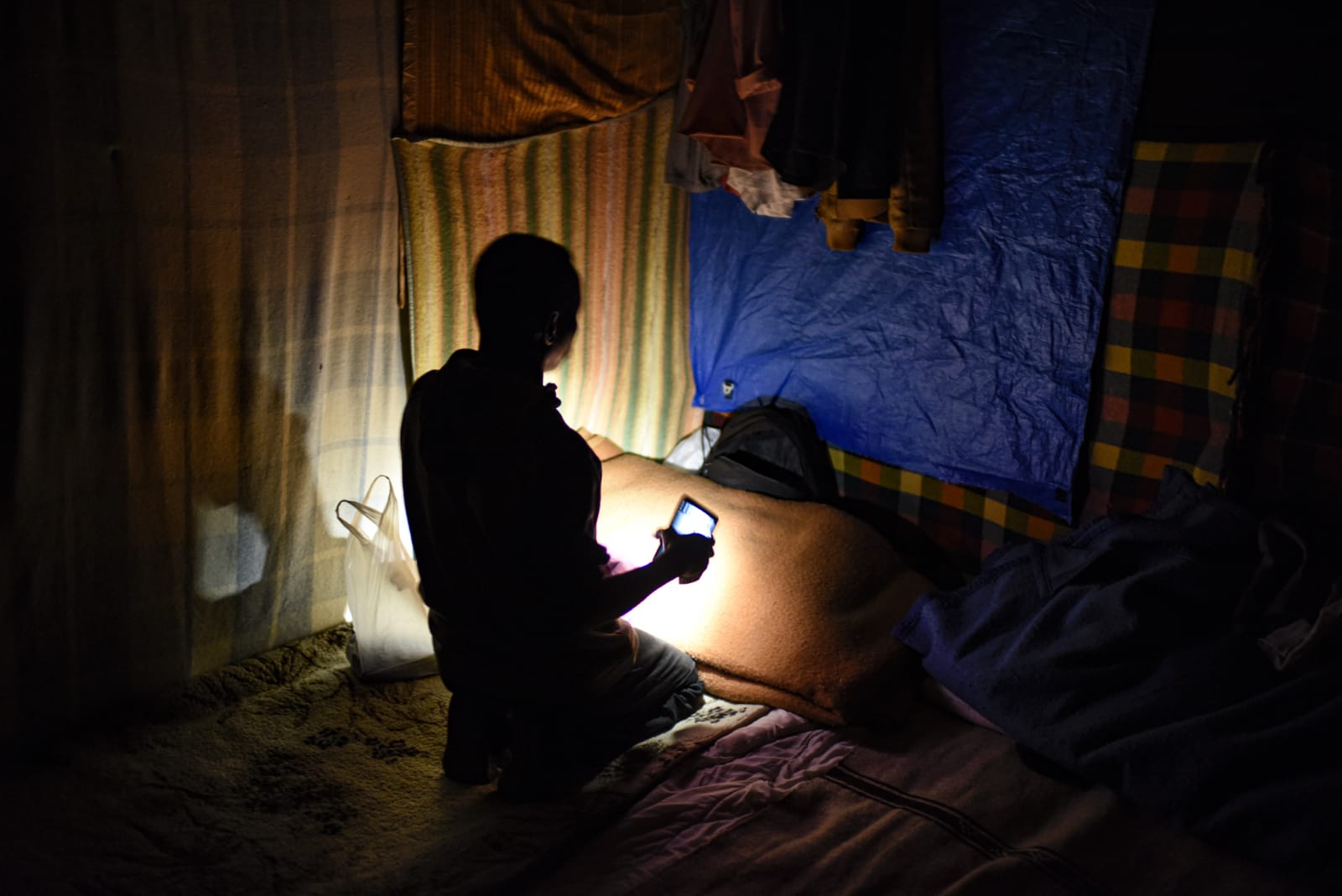 천막으로 집을 짓고 산다. 자선 단체의 기부품 없이는 생활이